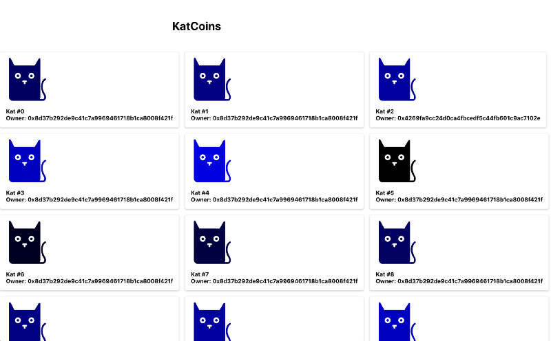 This will spin up your react app at http://localhost:3000. You should see the 30 KatCoins that the smart contract has minted, with their ids and their owner addresses.